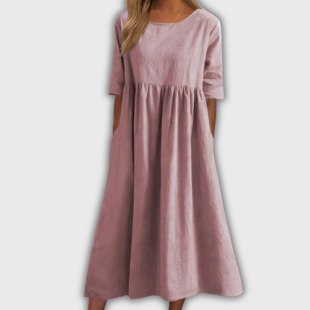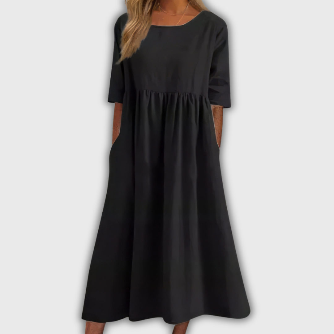 Ένα φόρεμα που συνδυάζει τέλεια την ελευθερία και την κομψότητα σε αρμονία. Η χαλαρή γραμμή κολακεύει τη σιλουέτα και προσφέρει μια άνετη εμπειρία φόρεσης – όλη μέρα. Είτε για χαλαρές βόλτες, είτε για ραντεβού σε καφέ, είτε για ειδικές στιγμές: αυτό το φόρεμα φέρνει διαχρονική γοητεία σε κάθε περίσταση.