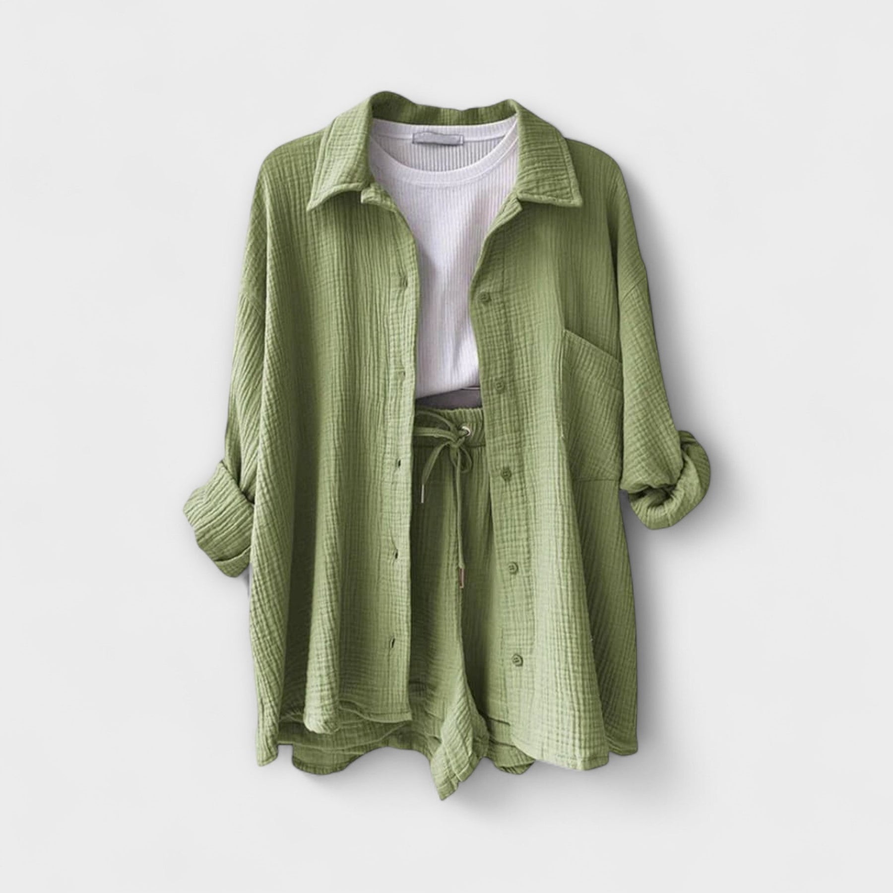 Το Βικτώρια | Άνετο Σετ 2 Τεμαχίων είναι ο τέλειος συνδυασμός άνεσης και στυλ για την γκαρνταρόμπα σας. Ιδανικό για ζεστές μέρες, αυτό το σετ είναι φτιαγμένο από αναπνεύσιμα υφάσματα και διαθέτει έναν ευέλικτο, κομψό σχεδιασμό. Είτε χαλαρώνετε δίπλα στην πισίνα είτε πηγαίνετε για μια casual έξοδο, αυτό το σετ προσφέρει μια κολακευτική εφαρμογή που σας κρατά δροσερούς και σίγουρους καθόλη τη διάρκεια της ημέρας.